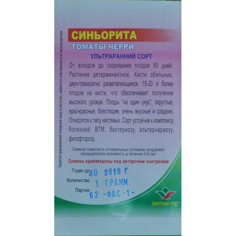 Сіньоріта - це ранній сорт томатів черрі. До періоду дозрівання окло 85 днів після сходів. На одній кисті формується від 15 і більше плодів. Плоди дуже дрібні, округлі, блискучі, оченб смачні і солодкі. Сорт стійкий до таких вірусів, як: ВТМ, бактеріозу, альтернаріозу і фітофторозу.