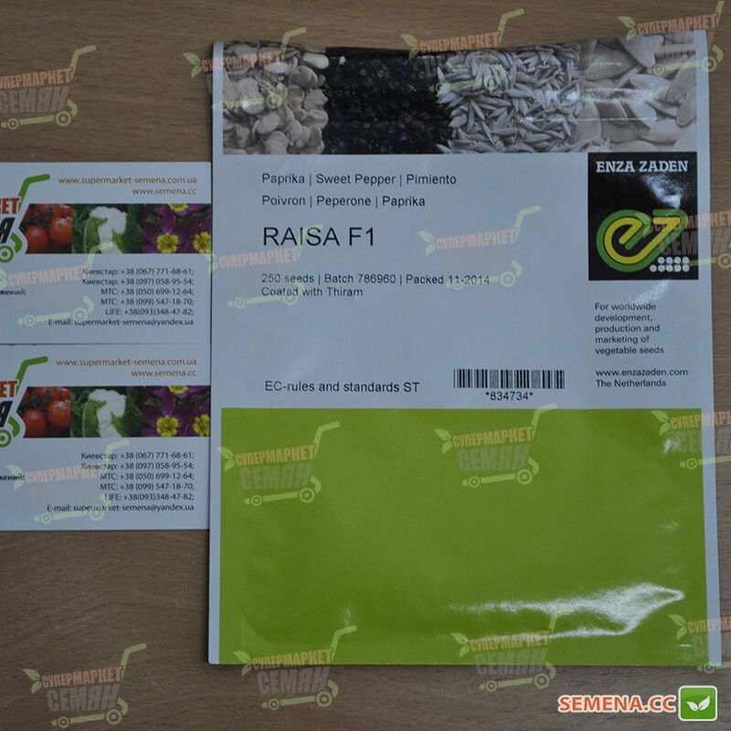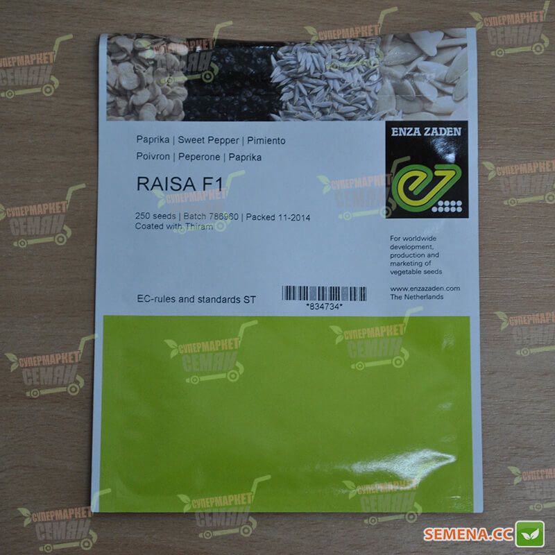 На фото представлена оригінальна упаковка насіння перцю «Раїса» номіналом 250 насінин компанії EnzaZaden/Энза Заден . Насіння зберігається в упаковці з щільного триплексу. Це дозволяє захистити насіння від сонячного впливу та зайвої вологи. Інформація на упаковці дана англійською мовою