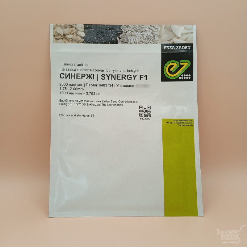 Сінерджи F1 насіння капусти цвітної (Enza Zaden). Період вегетації від висадки розсади 72-75 днів. Урожайний стресостійкий гібрид кольорової капусти з потужними рослинами.