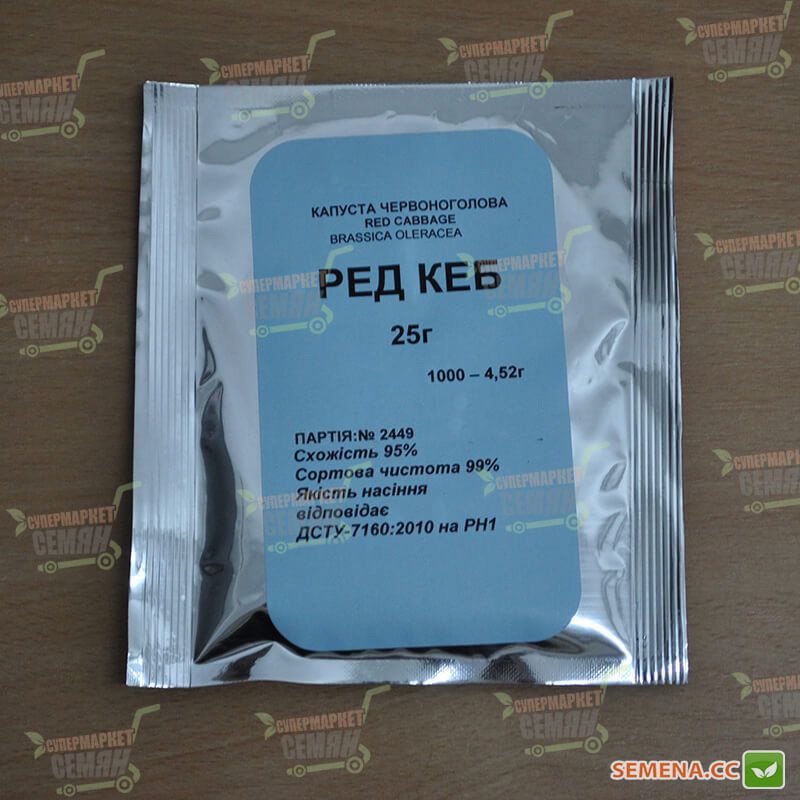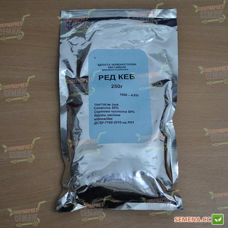 Насіння червонокачанної капусти Редкеб - це середньопізній сорт фіолетової капусти. Тривалість вегетаційного періоду - 90-100 днів. Голівка капусти має округлу форму, насичене фіолетово-червоне забарвлення, гарну щільність, вагою 2-3 кг. Червонокачанна капуста Редкеб добре транспортується, використовується для зберігання, стійка до розтріскування, толерантна до фузаріозу. Насіння червонокачанної капусти Редкеб оброблене тірамом, продається в фольгованому щільному пакеті.
