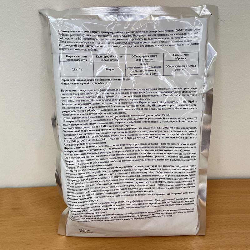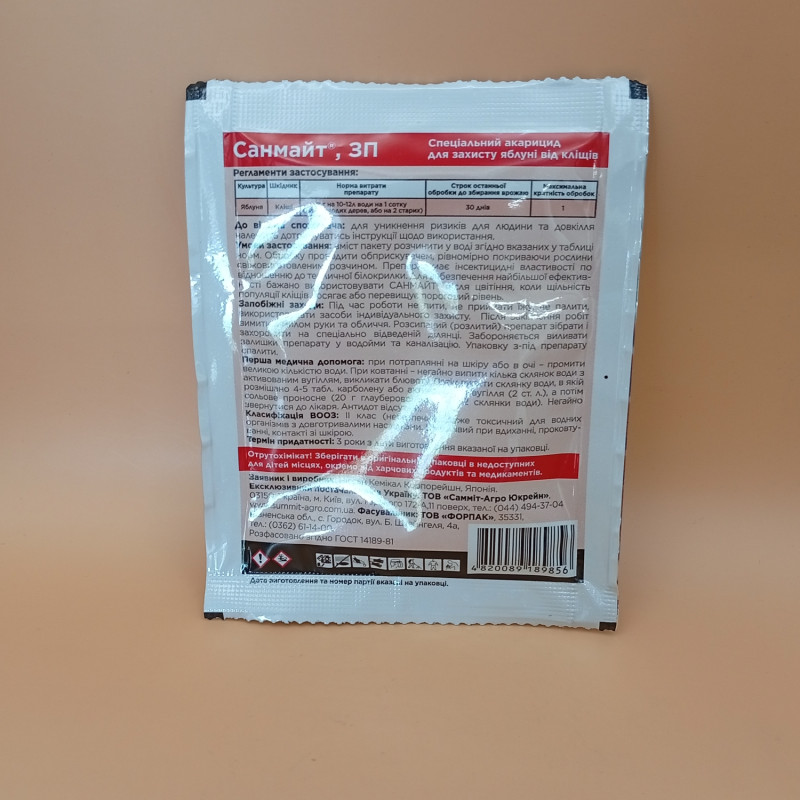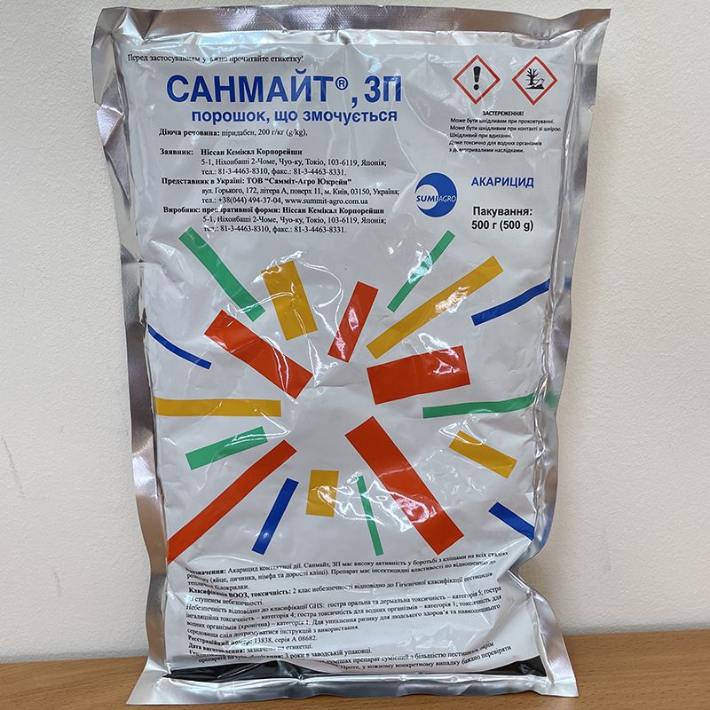 - Санмайт можна застосовувати в суміші з усіма традиційними інсектицидами та фунгіцидами, крім сильнолужних речовин, наприклад, бордоською рідиною.