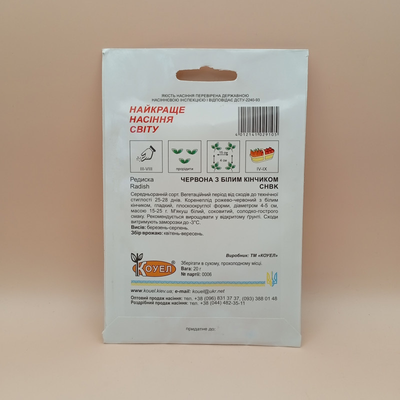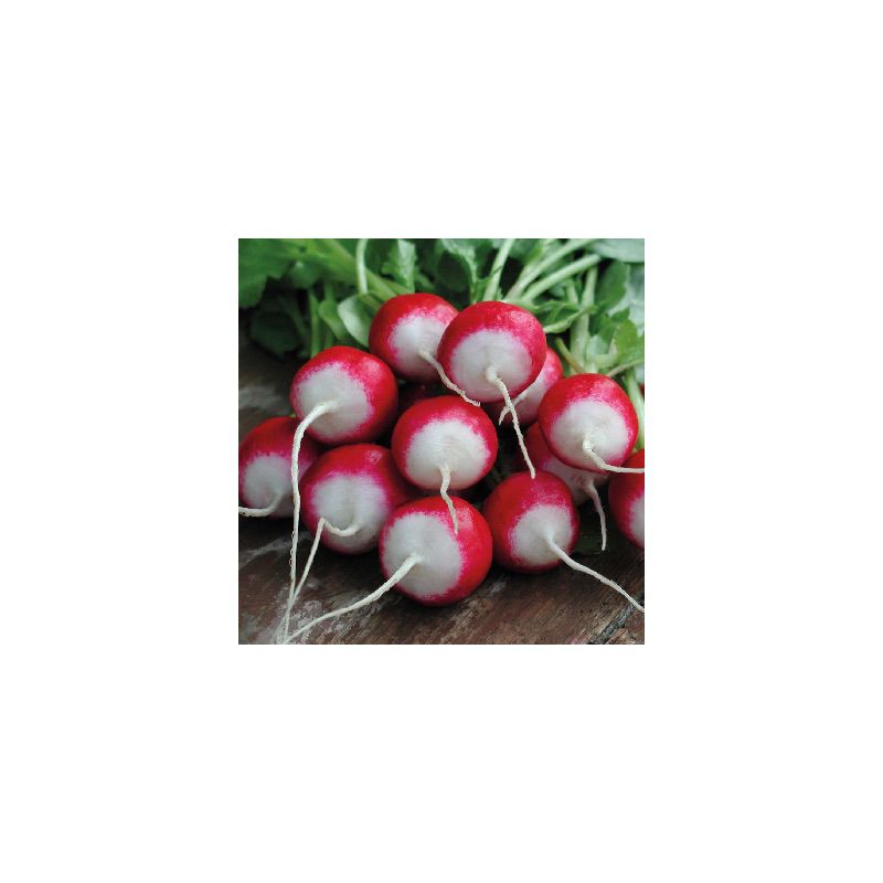 Редиска Червона з білим кінчиком - є середньостигли високоврожайним сортом. Від повних сходів до збору врожаю 22-25 днів. Рослина характеризується тим, що володіє коренеплодами круглої форми, червоного кольору з білим кінчиком. М'якоть біла, соковита, щільна, напівгострого смаку. Допускається вирощувати на відкритому грунті, в скляних і плівкових теплицях у весняний та осінній період. Посів насіння у відкритий грунт початок квітня - середина серпня. Всі ці фактори сприятливо впливають на якість товарної продукції.