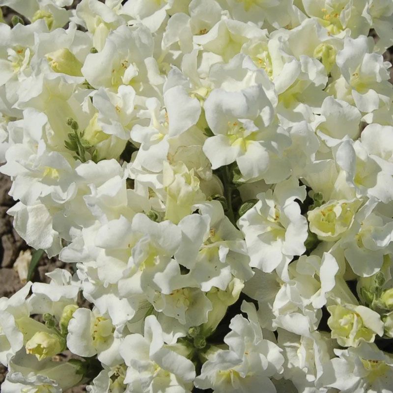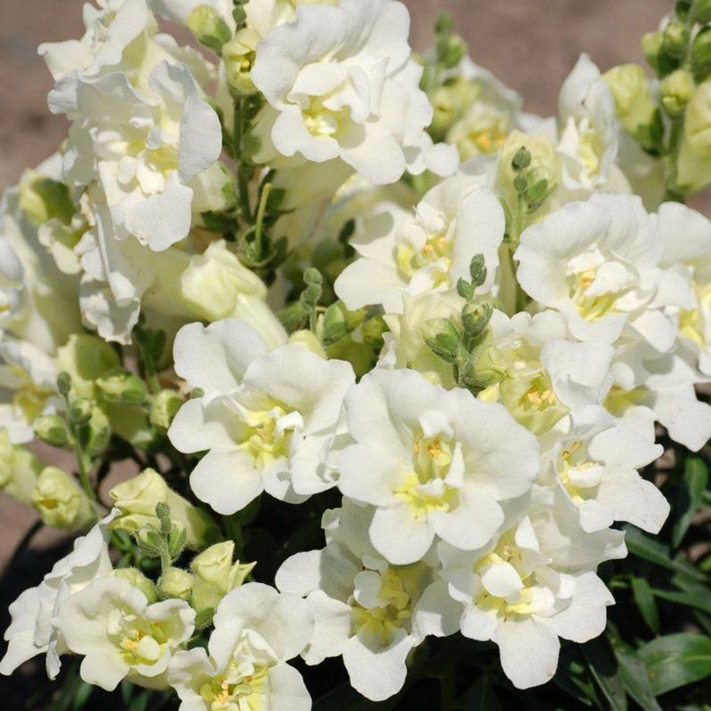 Левиний зів (антірінум) махровий Твіні F1 білий (Antirrhinum majus Twinny F1 white) – низькоросла серія з махровими і напівмахровими квітами (в залежності від умов вирощування).