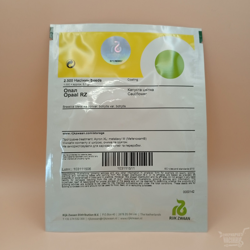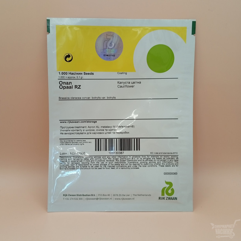 Опал - це ранній сорт цвітної капусти, яку вирощують в теплицях, а також у відкритому грунті або під агроволокном, або перфорованою плівкою. Опал починає дозрівати на 50-60й день з моменту посадки розсади. Тверді суцвіття білосніжного кольору, середня вага від 600 грамм до півтора кілограм.
