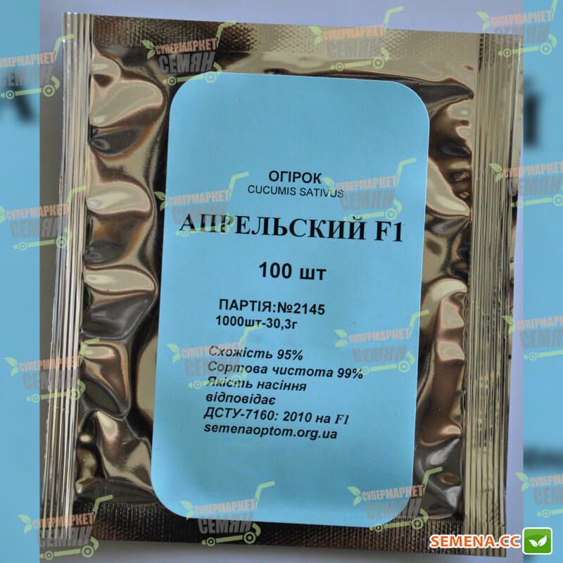 Насіння огірка Апрєльський F1 - середньоранній гібрид огірка бджолозапильного типу. Вегетаційний період складає 45-50 днів. Апрєльський F1 рекомендують вирощувати у плівкових, скляних, весняних теплицях, під плівкою та у відкритому ґрунті. Довжина огірків Апрєльський F1 - 15-25 см, маса - 200-250 грамів. Насіння гібриду Апрєльський F1 потрібно висівати після загрози заморозків, так як огірок не переносить холод. Маса 1 000 насінин огірка Апрєльський F1 - 30,3 грам. Оброблене оригінальне насіння огірка продається в щільній фольгованій упаковці.