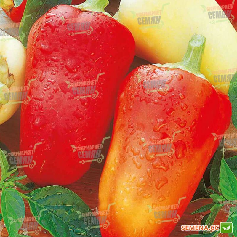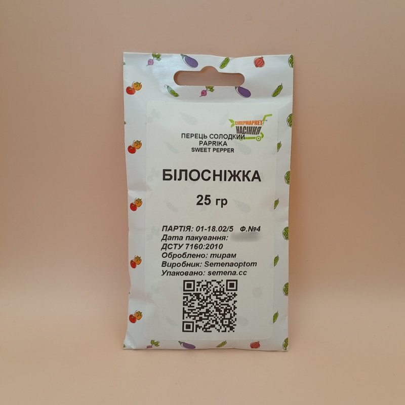 Насіння солодкого перцю Білосніжка - це середньоранній сорт перцю Угорського типу. У технічній стиглості плоди перцю Білосніжка білого забарвлення, в біологічній стиглості перці червоні. У технічну фазу стиглості перець входить через 110 днів після появи сходів. Рослина середньоросла, висотою близько півметра. Перчин Білосніжка масою 70-80 грамів, довжиною до 10 сантиметрів, конусоподібної форми. Маса 1000 насінин перцю Білосніжка - 6,25 грамів. Насіння перцю Білосніжка оброблені Тірамом і продаються в фольгованому щільному пакеті.