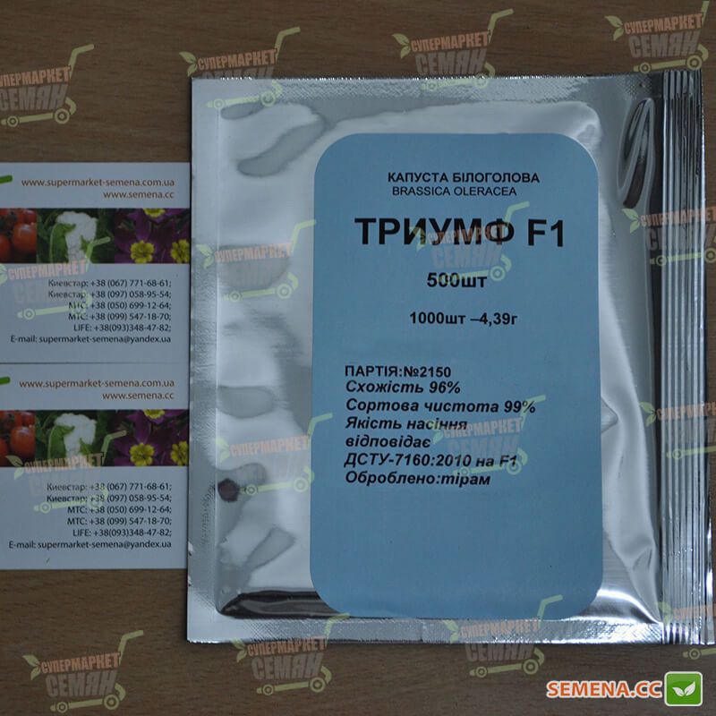 Тріумф F1 - це середньопізній гібрид білокачанної капусти. Повне дозрівання наступає на кінець четвертого місяця після сходів.