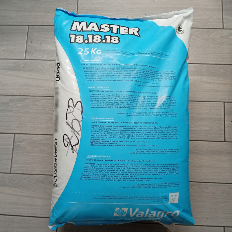 Майстер 18-18-18-3 - це концентроване добриво з високим вмістом поживних речовин, яке точно збалансовано для різних стадій зростання і особливостей грунту. Всі мікроелементи знаходяться в доступній для рослини хелатній EDTA –Cu, Fe, Mn, Zn формі. Рекомендації по використанню препарату Майстер при краплинному поливі на 1000 м2: