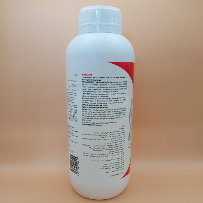 Радіфарм - це біостимулятор, який містить полісахариди, стероїд глюкозидів, амінокислоти і бетаїн. Він насичений вітамінами, мікроелементами. Розроблено даний препарат для розвитку бічних і додаткових коренів. Радіфарм допомагає переносити несприятливі фактори: висока температура, надлишок вологи. Рослини оброблені даним препаратом швидко поглинають воду, поживні елементи.