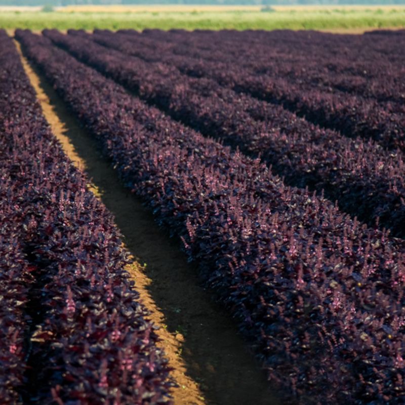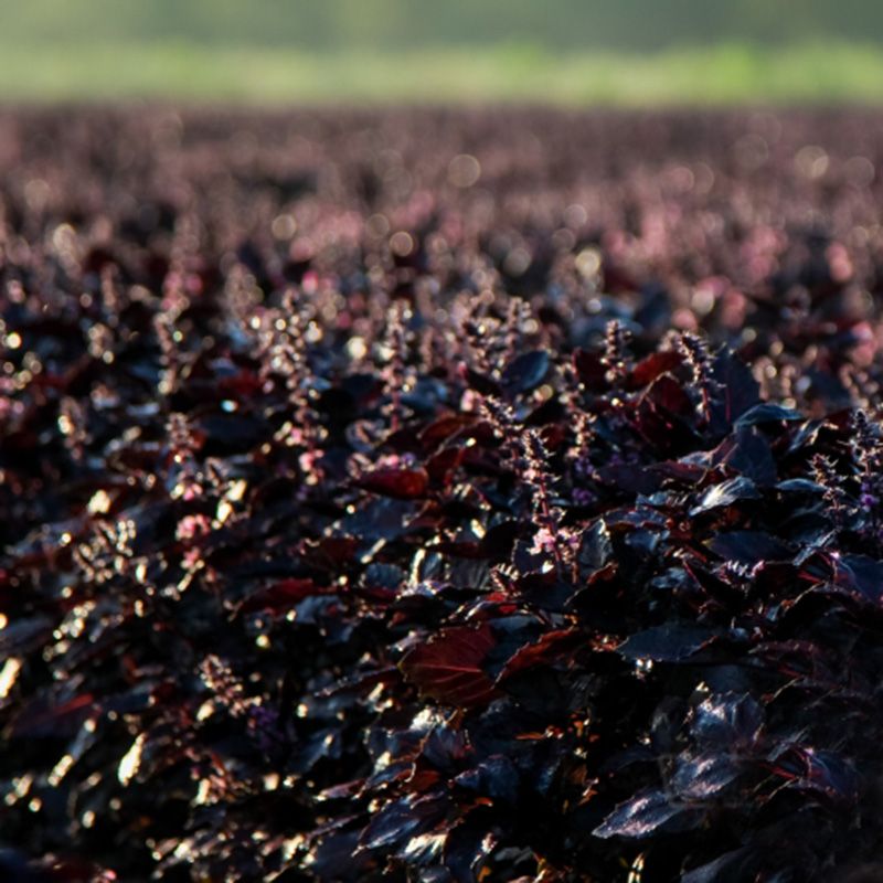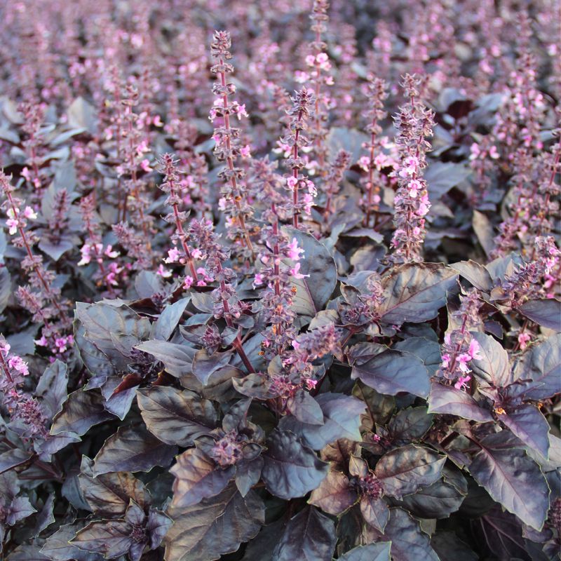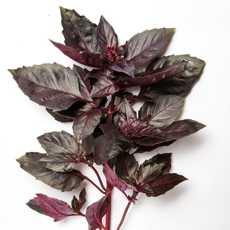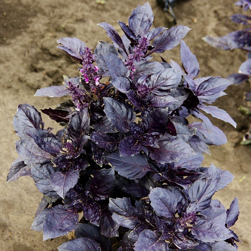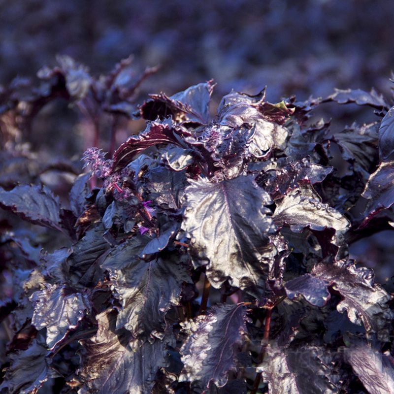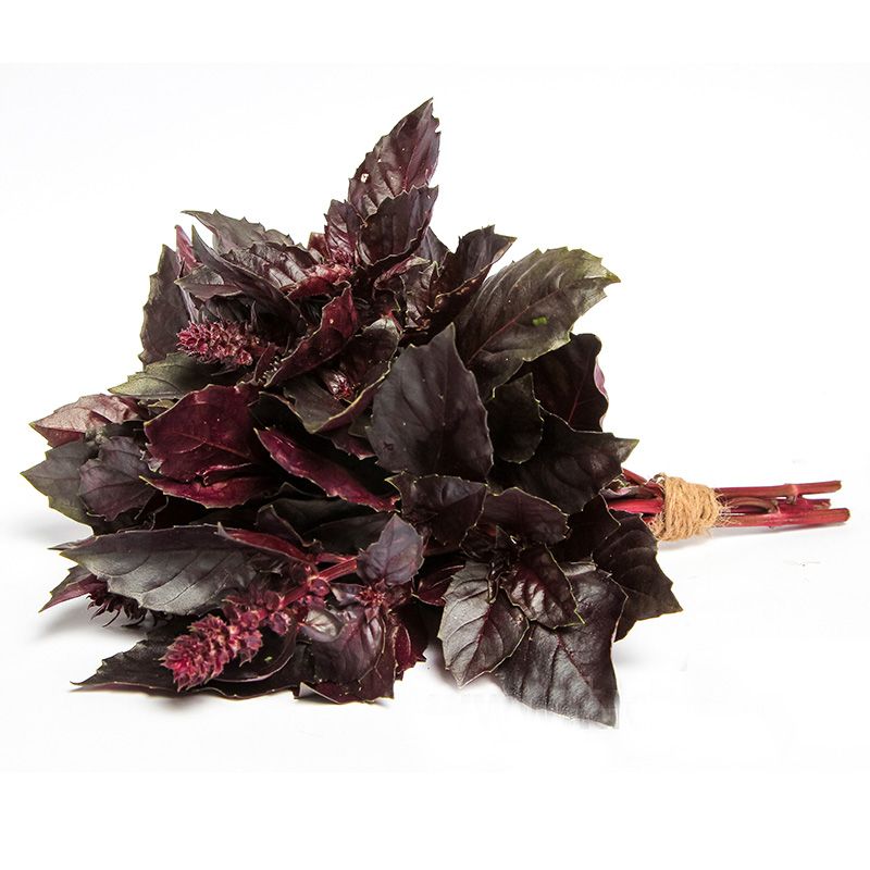 Особливості рослини – Висота куща – 30-50 см. Листя велике, фіолетового кольору. Має сильний специфічний аромат, який зберігається і після сушіння. Базилік багатий каротином і вітаміном С.