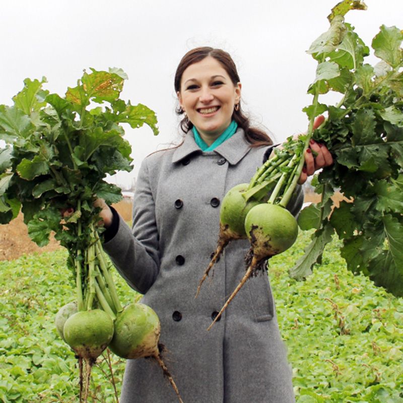 Характеристика плодів – Коренеплоди великі, округлої форми, вирівняні. Шкірка біла із зеленим відтінком і верхівкою, м'якоть біла, соковита з напівгострим смаком. Середня маса коренеплоду – 200-300 г.