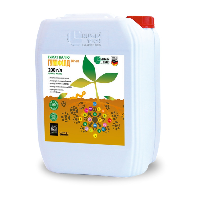Гуміфілд Вр-18 антистресант добриво Humintech — це універсальний засіб на основі гумату калію миттєво знімає біотичні та абіотичні стреси, допомагаючи культурам швидко відновлюватися та досягати максимальної врожайності.
