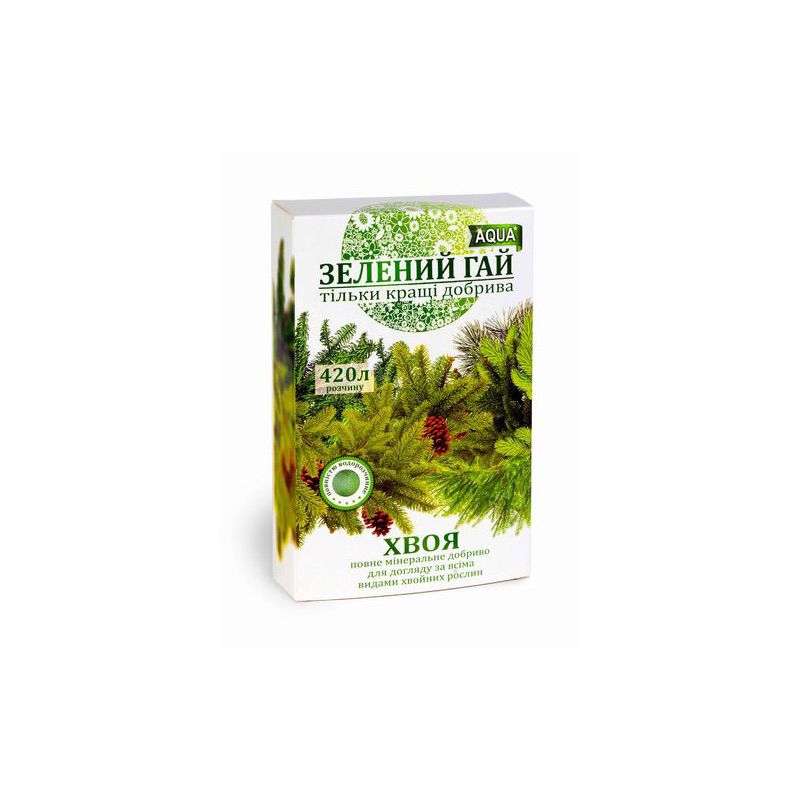 Зелений Гай Аква Хвоя - це швидкодіючий мінеральне добриво, яке використовується для всіх видів хвойних культур. Дане добриво стимулює швидке і рівномірне зростання. Своїм впливом підвищує значною мірою опірність до несприятливих факторів зовнішнього середовища. Стимулює коренеутворення і зростання листя. Підтримує декоративний вигляд хвойних рослин.