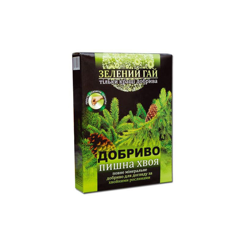 Зелений Гай Пишна хвоя - це швидкодіюче мінеральне добриво, яке використовується для всіх видів хвойних культур, в т.ч. сосна, ялина, ялівець, туя, ялиця, тис, модрина, кипарис та ін. Дане добриво стимулює швидке і рівномірне зростання. Своїм впливом підвищує значною мірою опірність до несприятливих факторів зовнішнього середовища. Стимулює коренеутворення і зростання листя. Підтримує яскравість листя і квіток.