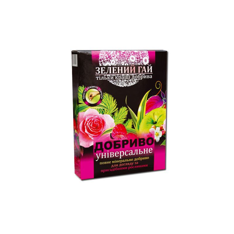 Зелений Гай Універсальне - це швидкодіюче мінеральне добриво, яке використовується для всіх видів садових культур. Дане добриво стимулює швидке і рівномірне зростання. Своїм впливом підвищує значною мірою опірність до несприятливих факторів зовнішнього середовища. Стимулює коренеутворення і зростання листя. Підтримує яскравість листя і квіток. Збільшує врожайність до 30-40%.