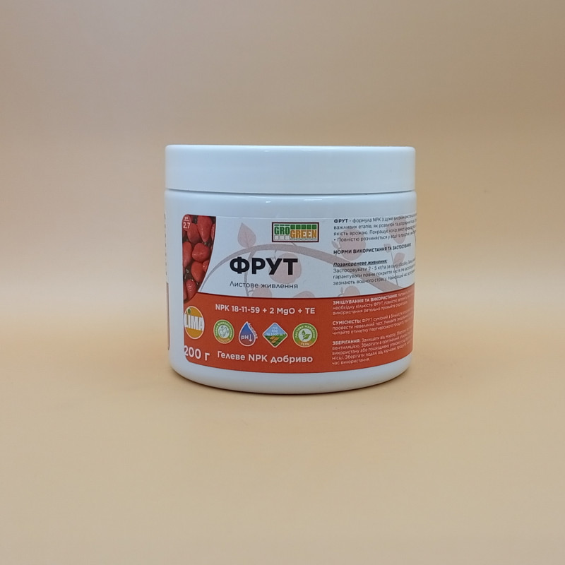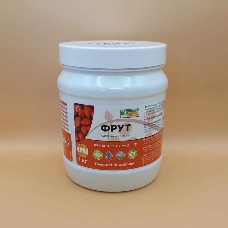 ЖЕЛ ФРУТ (GEL Fruit) (18-11-59) - даний препарат є добривом спеціально розробленим для збалансованого постачання кореневої системи і листового апппарата, що дозволяє збільшувати врожай і його якість. Завдяки своєму унікальному складу, дане добриво знижує симптоми стресу і захищає рослини від шкідливих факторів навколишнього середовища. Даний препарат є повністю розчинним і не містить нерозчинних елементів.