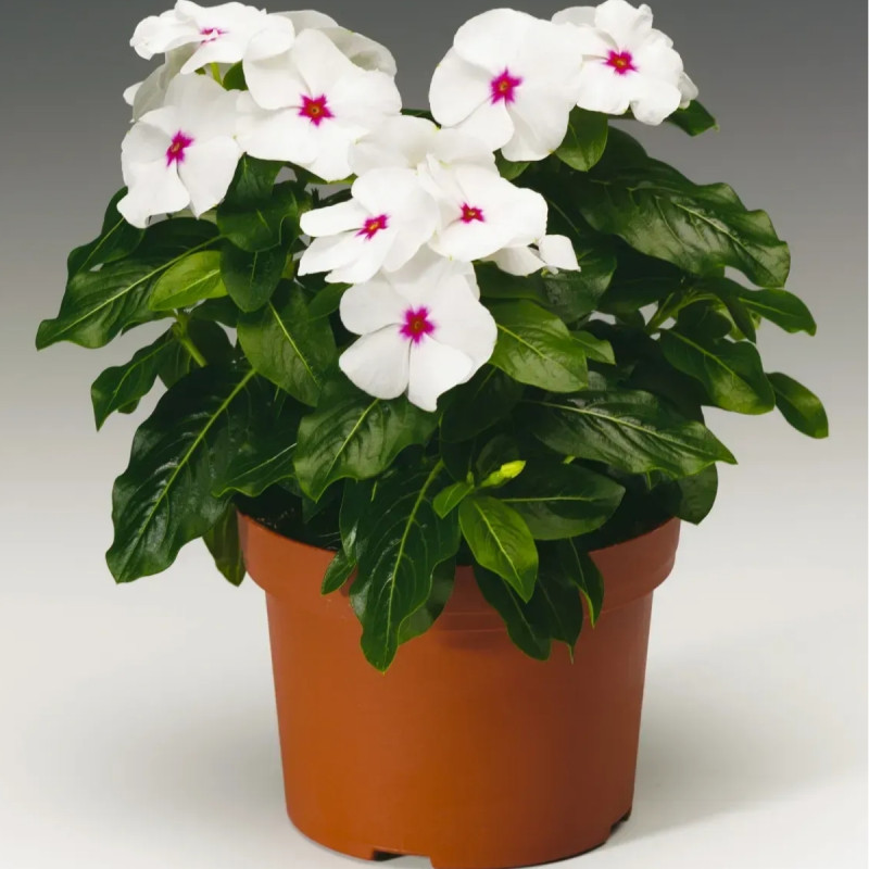 Квіти в катарантуса Sunstorm дуже яскраві і великі, листя темно-зелена блискуче.