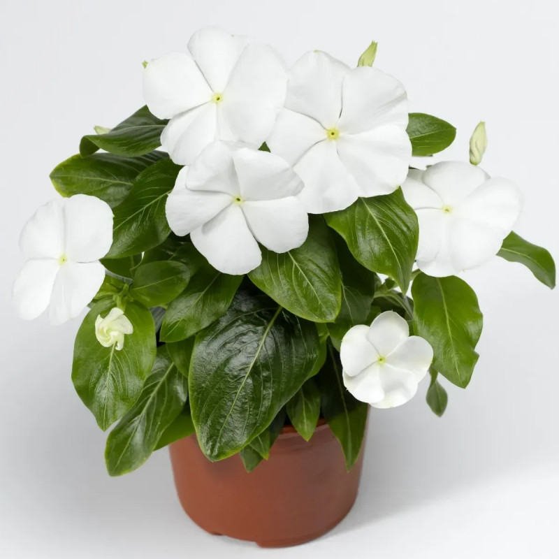 Квіти в катарантуса Sunstorm дуже яскраві і великі, листя темно-зелена блискуче.