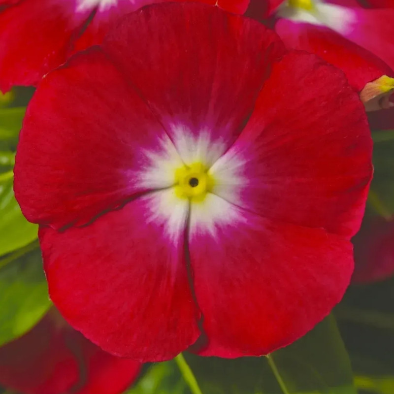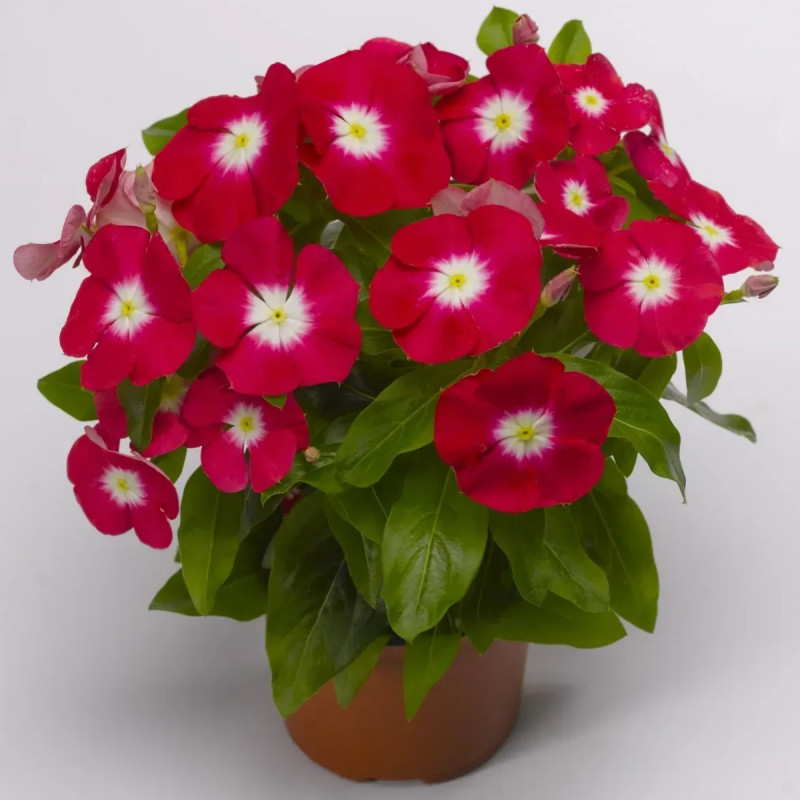 Цветы в катарантуса Sunstorm очень яркие и большие, листва темно-зеленая блестящая.
