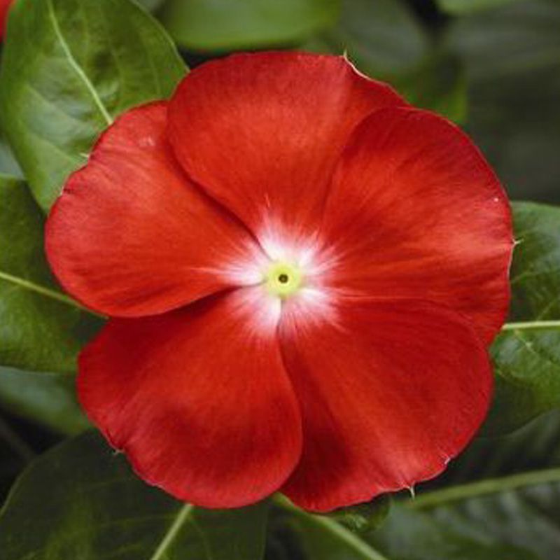 Катарантус СанШторм F1 Скарлет з вічком (Sunstorm scarlet with eye) – це рослина з дуже великими і яскравими квітами, листя темно-зелені блискучі. За кілька останніх років завойовує позиції на ринку продажів розсади квітів і в ландшафтних дизайнерів.