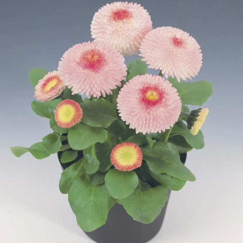 Маргаритка Тассо пінк (рожева) - удосконалена серія помпонного типу. Густо махрові квітки Тассо досягають 5 см в діаметрі, що в 2 рази більше звичайних Помпонетт!