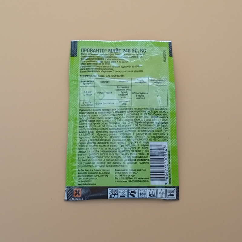 Яблуня | Рослиноїдні павутинні кліщі, бурі плодові кліщі | 4-6 мл / 10 л води / 6-8 дерев (до 5 років) або 3-4 дерева (понад 5 років) |