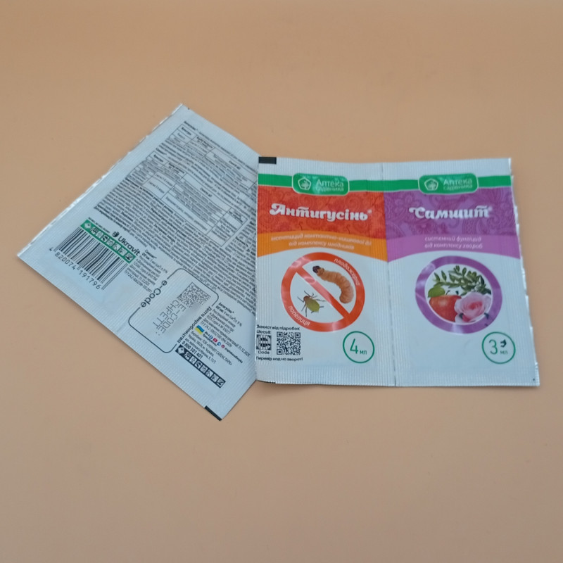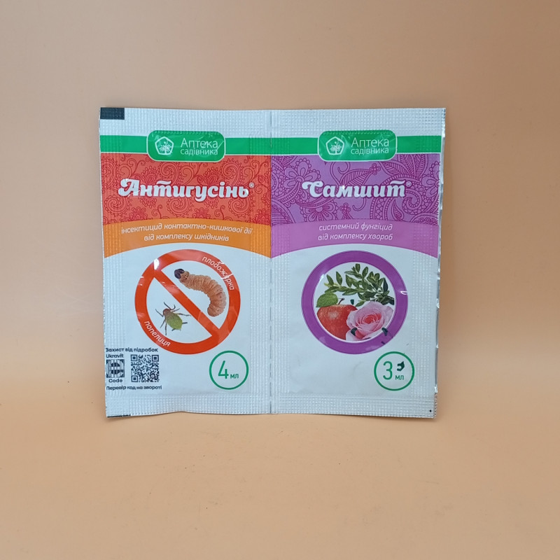 Яблуня | Плодожерки, листовійки, попелиці, борошниста роса, парша, курчавость листя і ін. | Обприскування в період вегетації | 4 мл+ 3 мл на 5л води на 1 сотку |