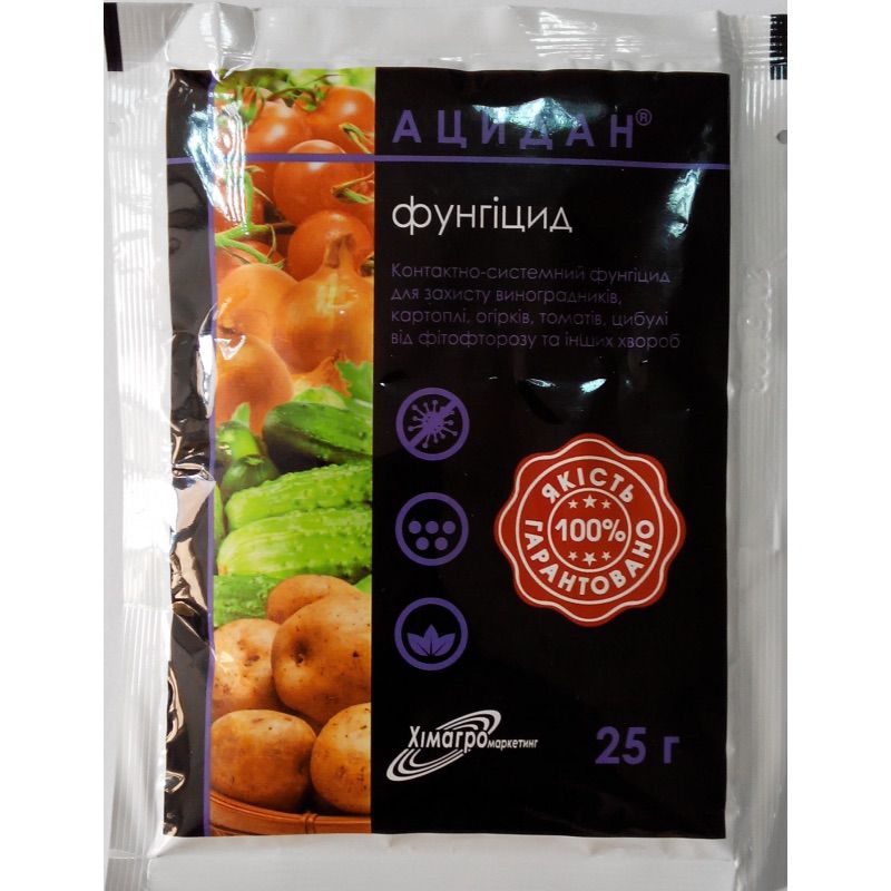 Ацідан - контактно-системний фунгіцид захисної та терапевтичної дії для захисту винограду, картоплі, томатів, огірків, цибулі та інших сільськогосподарських культур від збудників несправжньої борошнистої роси (мілдью на винограді), фітофторозу, макроспоріозу та інших плямистостей.
