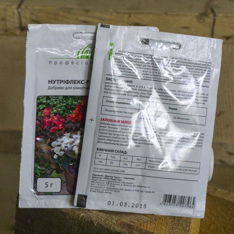 Нутріфлекс F - це добриво характеризується високою швидкістю впливу і є універсальним для будь-яких видів кімнатних квітів і рослин. Своїм впливом допомагає рослинам при фотосинтезі і зміцнює природний імунітет перед захворюваннями. У своєму складі містить мікро- та макроелементи в хелатній доступній для рослин формі.
