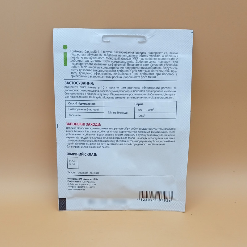 Монокалій фосфат - це добриво є повністю водорозчинним. Призначено для внесення на культурні рослини з метою підвищення імунітету проти грибкових захворювань. У складі препарату знаходиться (Р205) - 2% і (К20) - 34%.