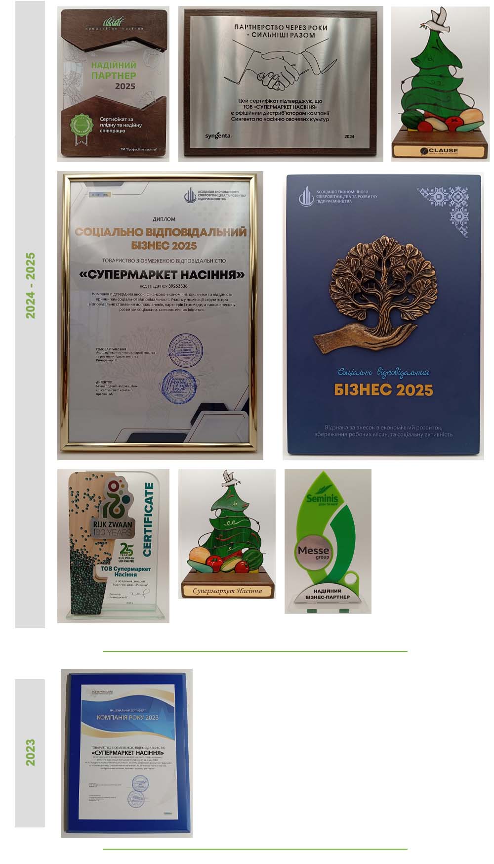 Так, ми з великою гордістю говоримо,що маємо честь бути названими експертами насіння "Nunhems", одними з лідерів в офіційному дистриб'юторстві компаніями «Syngenta» і «Rijk Zwaan», отримали сертифікат визнання «Друзі Семініс» за високий рівень продажів і грамотну маркетингову програму, стали офіційними партнерами компанії «CLAUSE», протягом чотирьох років є одним з кращих дилерів компанії «Bejo Zaden» (нагороджені грамотою від керівництва компанії).